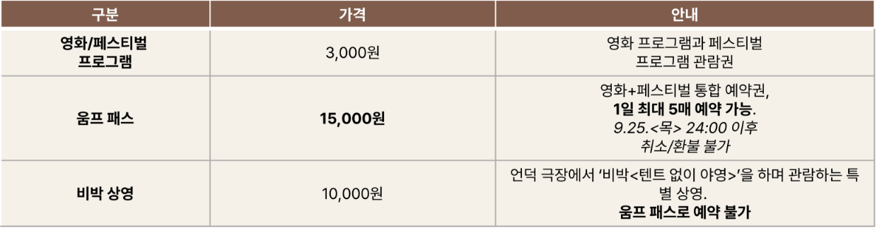 팁: 여러 섹션을 폭넓게 즐길 계획이라면 ‘움프 패스’로 하루 동선을 잡고, 비박 상영은 별도 단일권을 미리 확보하는 편이 유리하다.