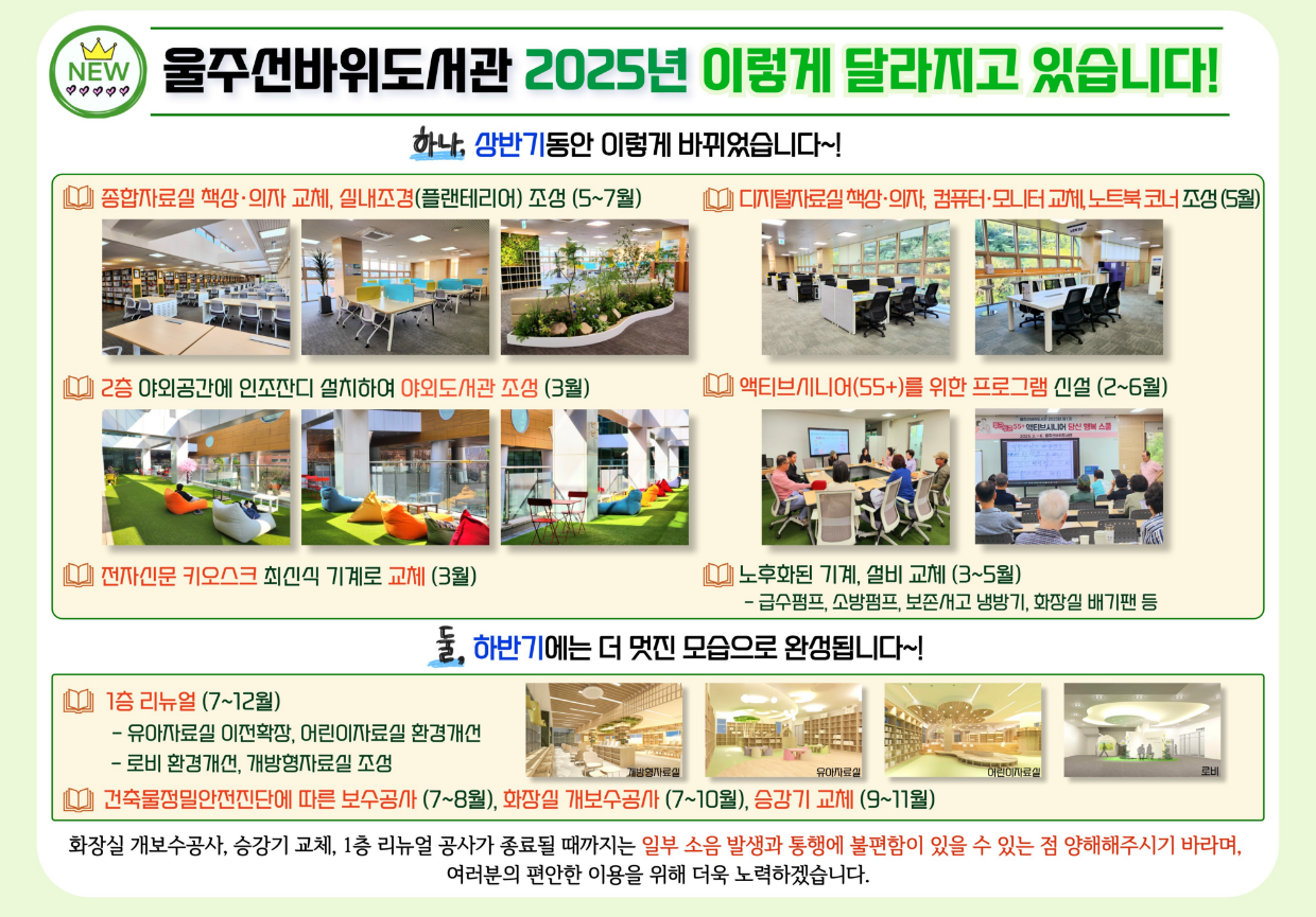 울주군 선바위도서관이 시설개선공사와 리뉴얼을 마치고 2025년 8월 20일부터 정상운영을 시작했다. 이번 리뉴얼은 군민들이 더욱 안전하고 편리하게 도서관을 이용할 수 있도록 공간과 시설을 개선하는 데 중점을 두었다.