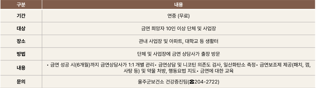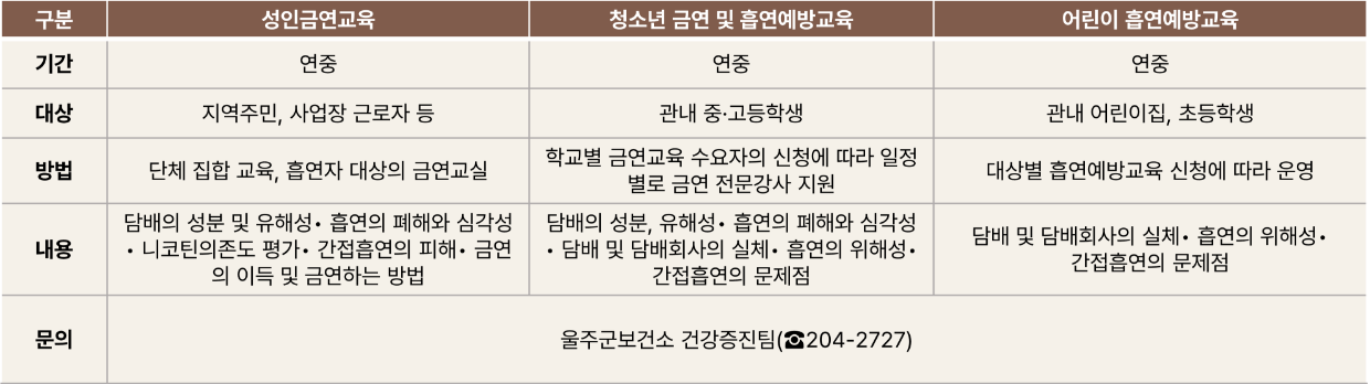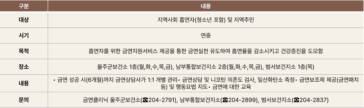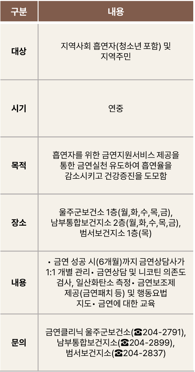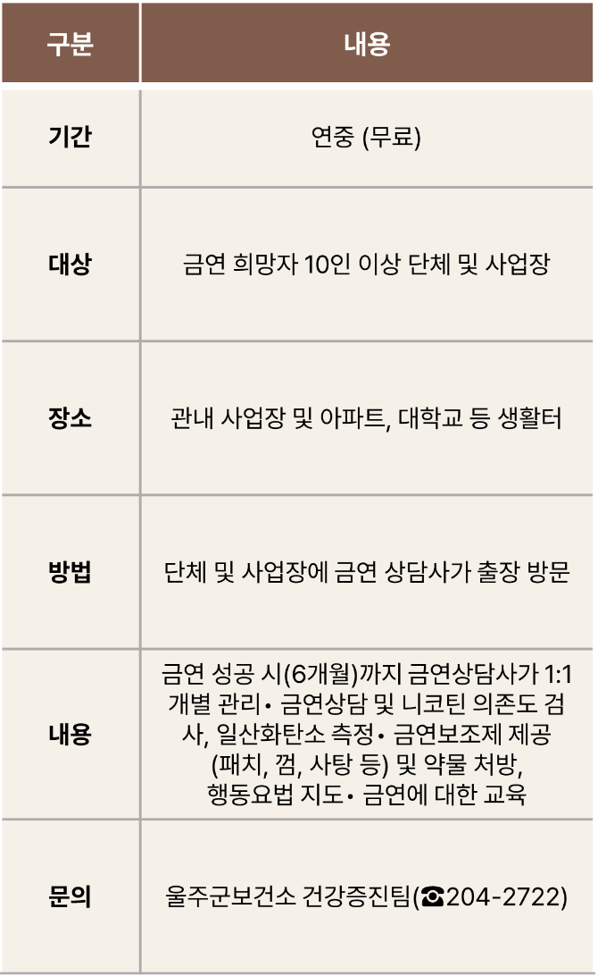 울주군은 군민의 건강을 지키고 흡연율을 낮추기 위해 다양한 금연 지원 사업을 연중 운영하고 있다. 금연을 희망하는 개인에게는 전문상담사를 통한 1:1 맞춤형 관리와 니코틴 보조제 제공, 행동요법 지도 등을 지원한다. 또한 단체와 사업장, 학교, 지역사회를 대상으로 찾아가는 이동금연클리닉과 금연·흡연예방 교육을 운영하여 누구나 손쉽게 참여할 수 있도록 하고 있다.