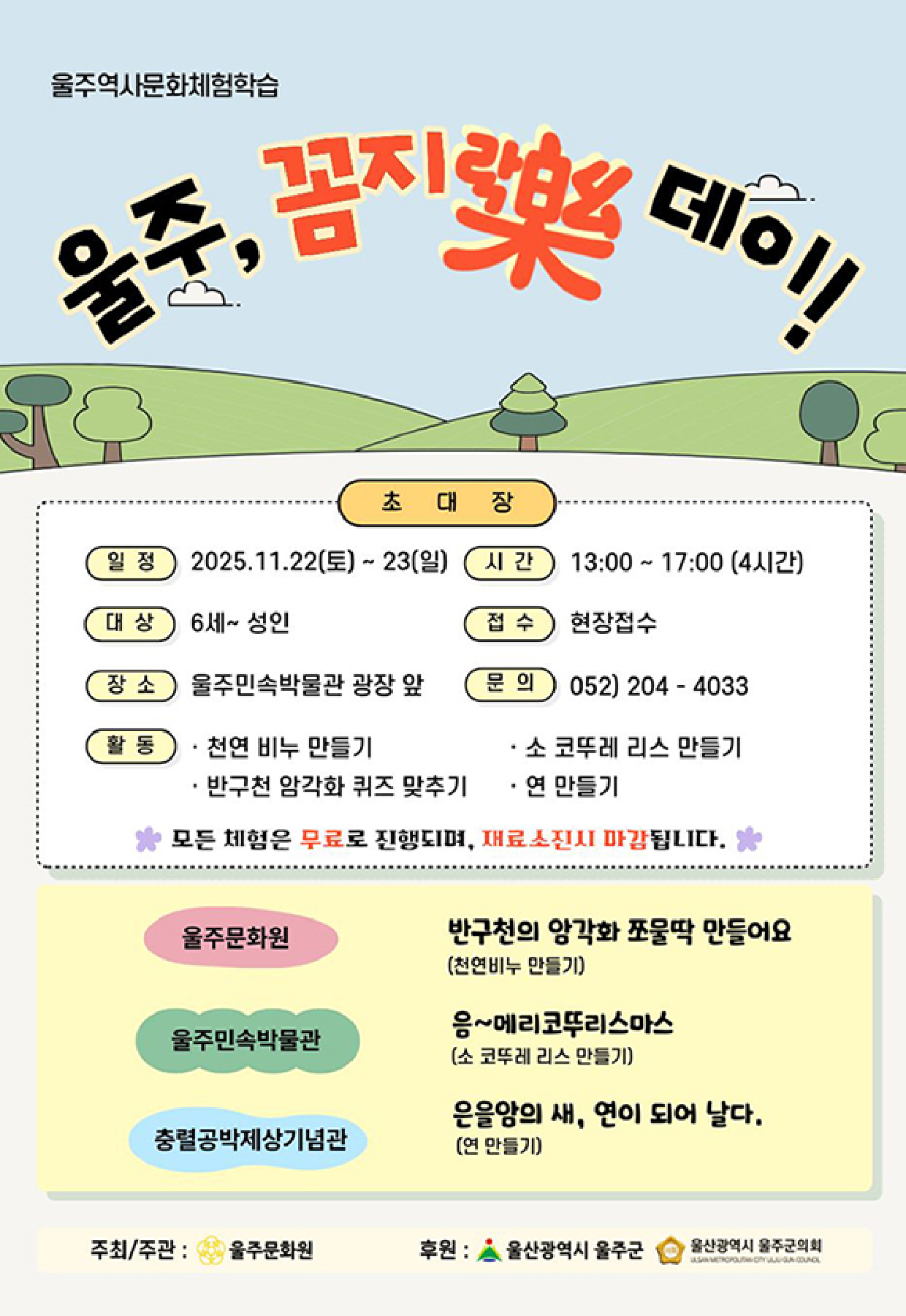 역사와 민속은 책 속 지식으로만 남기 쉽다. 손으로 만들고 몸으로 경험하는 순간에야 생활 속 기술과 이야기가 와닿는다. 이번 ‘울주, 꼼지락樂 데이!!’는 아이부터 어른까지 함께 즐기는 참여형 체험으로, 반구천 암각화에서 착안한 공예부터 전통 소 코뚜레를 응용한 리스, 하늘을 수놓는 연 만들기까지 한 자리에서 만나게 한다. 모두 무료이며 현장접수로 누구나 가볍게 참여할 수 있다.